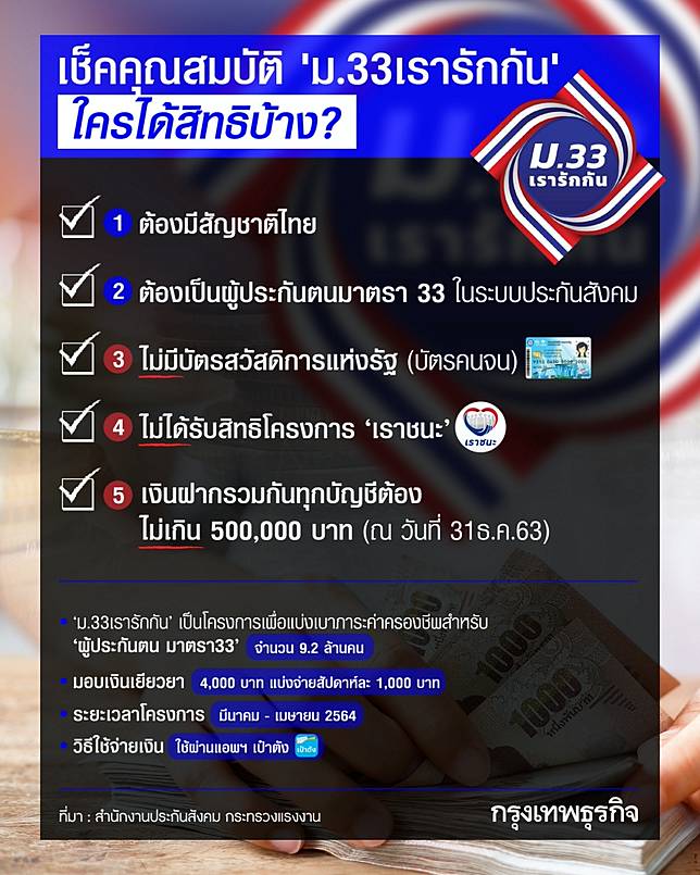 Jtklnmjuebxvfm from image.bangkokbiznews.com สัปดาห์ละ 1,000 บาท ภายใต้โครงการชื่อว่า ม.33 เรารัก. เราชนะ กลุ่ม 2 ผู้ที่เคยใช้สิทธิ คนละครึ่ง. 'เราชนะ' เปิด www.เราชนะ.com ให้กลุ่ม 'คนละครึ่ง' เราเที่ยวด้วยกัน ตรวจสอบสิทธิ 5 ก.พ.; ในกรณีที่ผู้ประกันตนมาตรา 33 ที่ตรวจสอบสิทธิ์แล้ว ไม่ได้รับสิทธิ์ตามโครงการ ม.33 เรารักกัน สามารถขอทบทวนสิทธิ์ผ่านเว็บไซต์ www.ม33เรารักกัน.com ได้. สำหรับการขอทบทวนสิทธิในโครงการ ม.33 เรารักกัน เพื่อขอให้มีการพิจารณาใหม่อีกครั้ง มีดังนี้. รัฐเตรียมเปิดลงทะเบียน โครงการเรารักกัน ผ่านเว็บไซต์ www.ม33เรารักกัน.com เยียวยาผู้ประกันตนตามมาตรา 33 สามารถเช็คสิทธิ์ เงื่อนไข หลักเกณฑฺ์ และ. เราไม่ทิ้งกัน www.com ตรวจสอบสถานะ เช็คสิทธิ์เราไม่ทิ้งกัน เงินเยียวยาโควิด 5,000 บาท เริ่มจ่ายถึงมือประชาชนผู้ผ่านเกณฑ์กลุ่มอาชีพผ่านระบบแจ้ง. Www.ม33เรารักกัน.com หากลงทะเบียนแล้ว ไม่ได้รับสิทธิ์ สามารถ ขอทบทวนสิทธิ์ เพื่อรับเงินเยียวยา 4,000 บาทได้